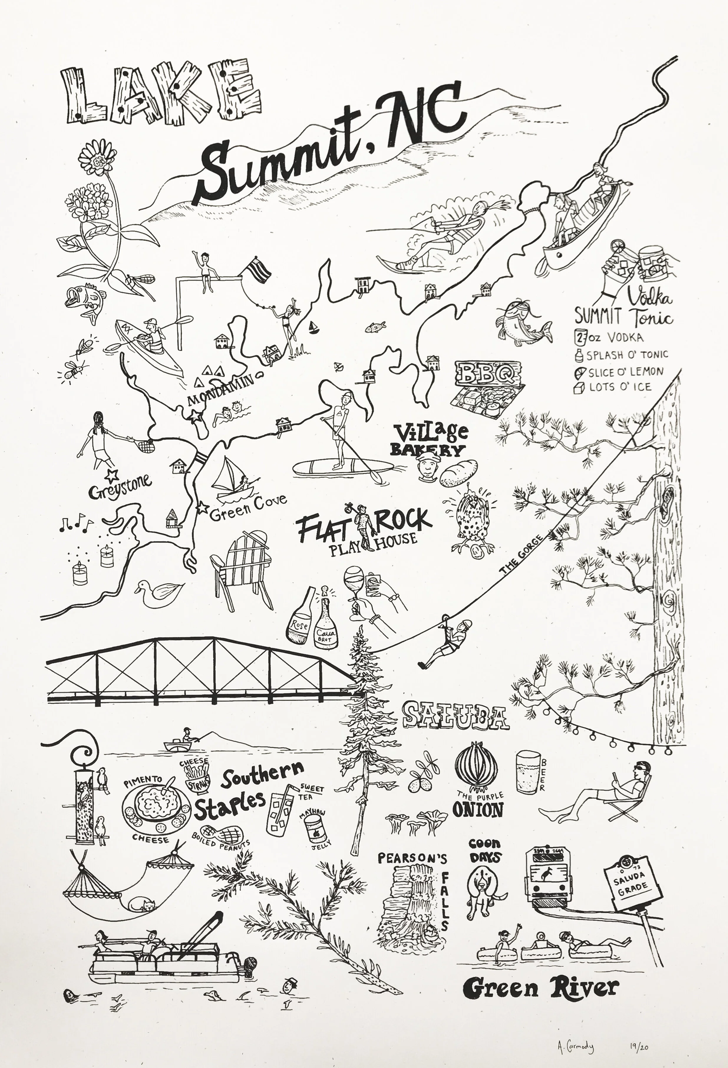 This limited-edition screen print was drawn on the shores of Lake Summit and screen printed by hand. The print depicts fun times on the lake and friends enjoying the signature drink of Lake Summit, a Vodka Tonic!